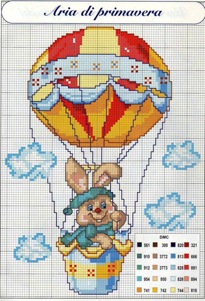 Bunny on hot-air baloon free cross stitch baby blanket pattern