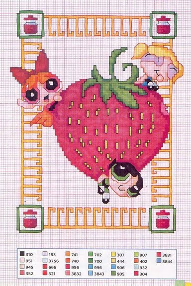 The Powerpuff Girls are sitting on a big strawberry