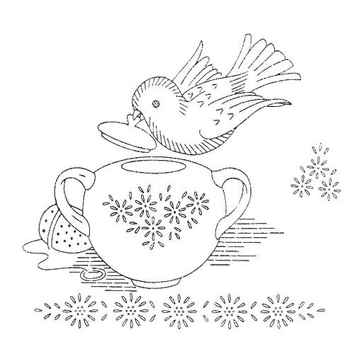 Embroidery pattern bird with teapot